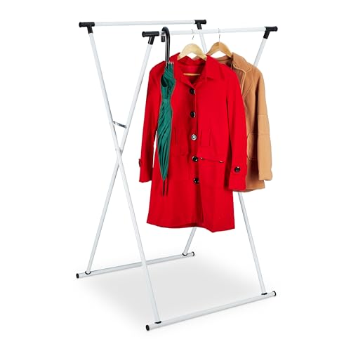 Relaxdays Portant à vêtements Extensible, HxLxP : 139x135x95 cm, 2 tringles, pour l’entrée, Valet Pliable, métal, Blanc