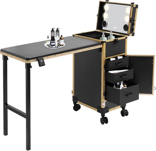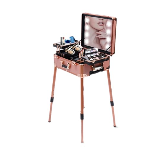Valise de Maquillage Professionnel avec Table,Pliable Valise Coiffure avec Lampe et Roues,Dimmable 3500-6500K,pour Maquilleurs, Coiffeurs, Esthéticiennes (Or)