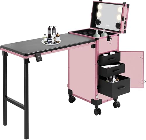 Valise de Maquillage Professionnel avec Table,Pliable Valise Coiffure avec Lampe et Roues,Dimmable 3500-6500K,pour Maquilleurs, Coiffeurs, Esthéticiennes (Rose)