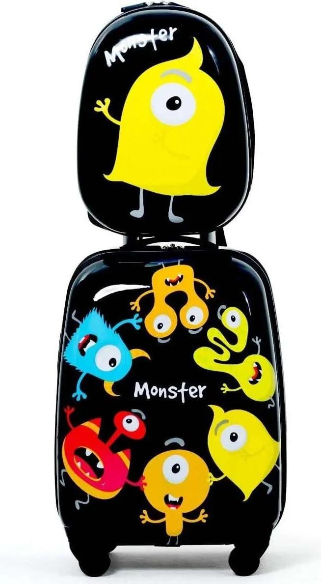 RELAX4LIFE Set de Valise Enfant à roulettes 16" et Sac à Dos 12" en ABS, Bagage Trolley Enfant pour Voyage, École, Jardin d’Enfant, Éléphant Coloré/Poulain Rose/Zoo Bleu (Monstre Noir)