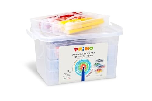 PRIMO - 120 Feutres Pointe Fine 2,5 mm lavables pour enfants +3 Ans, Valisette de 12 Couleurs pour Colorier, dessiner, Travaux Créatifs, Produit de Papeterie pour École et Loisirs Créatifs