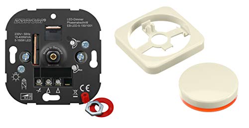Garantie de 5 ans ! Variateur rotatif à LED encastré EBROM® + couvercle de variateur Busch Jaeger 2115-212 DURO2000 blanc crème, section de phase, pour LED 5-150 watts + halogène à intensité variable, etc. 15-400 W/VA