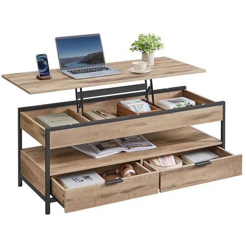 VASAGLE Table Basse, Table de Salon avec Plateau Relevable, Tiroirs de Rangement, avec Rangement Ouvert et Compartiment Caché, 50 x 120 cm, Marron Camel et Noir d’Encre LCT252K02