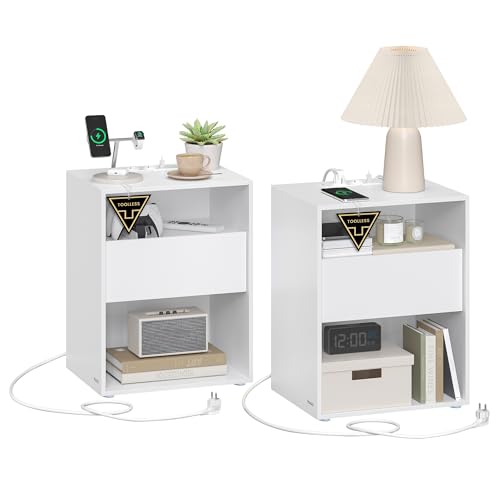 VASAGLE Table de Chevet, Assemblage sans Outils, Lot de 2, Table d’Appoint avec Multiprise et Tiroir, Moderne, Chambre, Salon, Blanc Mat LET776W01