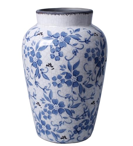 vase Décor Bleu et Blanc Floral en Céramique Vintage de 27 cm pour Pièces Centrales, Vase Chinoiserie Rustique pour Décoration de Ferme