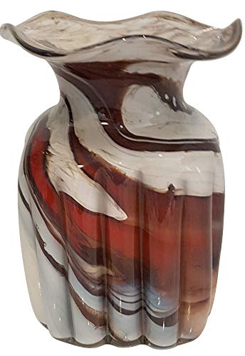 Grande vase en verre colore, vase decoratif en verre souffle a la bouche dans la couleur rouge beige blanc marbre dans la partie inférieure avec rainures optiques hauteur env. 20 cm