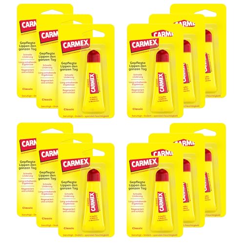 Carmex Classic Tube - Baume à lèvres pour lèvres sèches - Hydratant et apaisant pour les lèvres gercées - Avec vaseline, vitamine E et cire d'abeille - 12 x 10 g