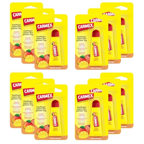 Carmex Peach Mango Tube Baume à lèvres hydratant et apaisant pour lèvres gercées avec vaseline, vitamine E et cire d'abeille (12 x 10 g)