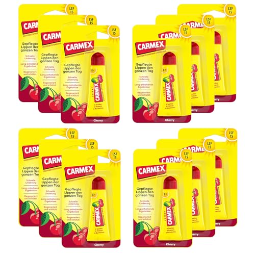 Carmex Cherry Tube Baume à lèvres hydratant et apaisant pour lèvres gercées avec protection solaire, vaseline, vitamine E et cire d'abeille - 12 x 10 g