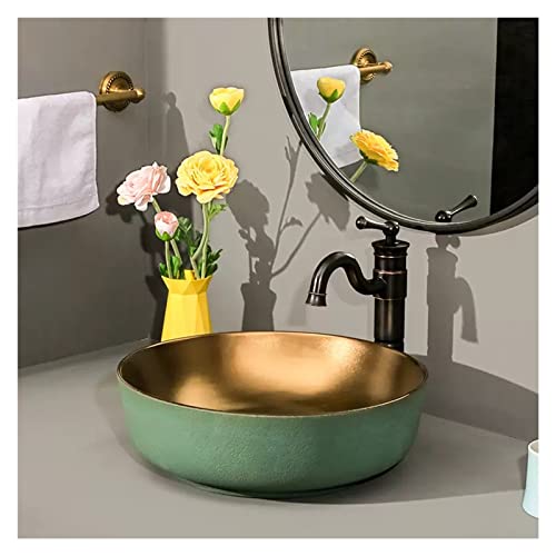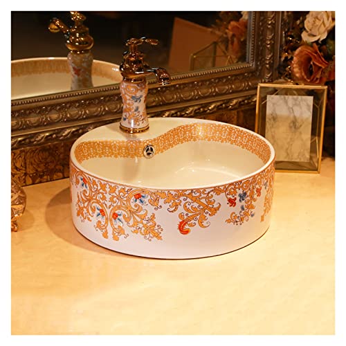 IROEJT Vasque Ronde à Poser, Luxueuse Vasque Artistique en Porcelaine avec Robinet et bonde clic-clac, Meuble-lavabo Classique à Poser.