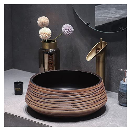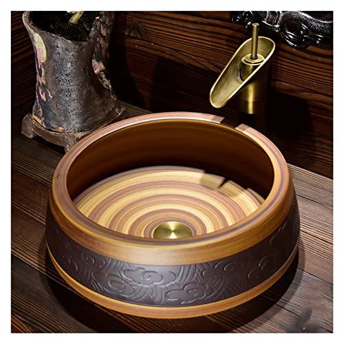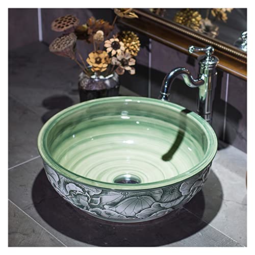 IROEJT Lavabo Vasque Vintage, Vasque Ronde Artistique à Poser sur Un comptoir de Salle de Bain avec Robinet et bonde escamotable, Vasque en Porcelaine sculptée de Style Chinois pour Meuble-lavabo