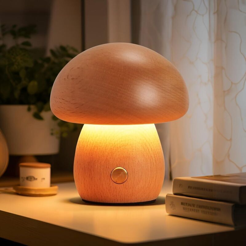 Lampe Champignon en Bois, Lampe de Chevet Portable à Intensité Variable Rechargeableavec usb, Veilleuse sans fil, Lampe de Table Champignon pour la