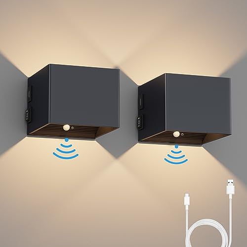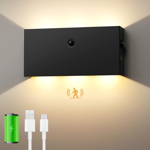 WOKWOYIO Applique Murale Intérieur, Lampe Murale Sans Fil avec Détecteur de Mouvement, Applique Murale Sans Fil Rechargeable USB, Veilleuse Magnétique pour Chambre Couloir, 3000K, 5200mAh, Noir