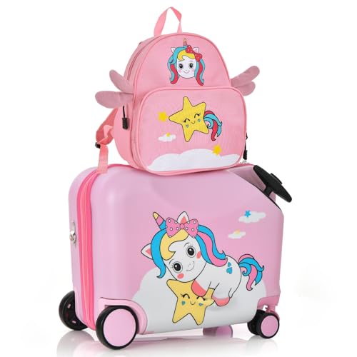 DREAMADE Valise Roulette Enfant 18" et Sac à Dos 12" avec Bandoulière Réglable Bagage Cabine Enfant 3+Ans avec Roues Pivotante 360° Bagage à Main Fille et Garçon Charge 50KG+8KG (Licorne Rose)