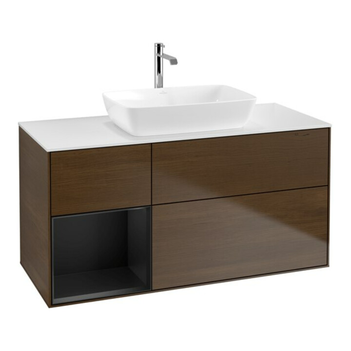 Villeroy & Boch V&B Finion Meuble sous lavabo 120 cm, blanc brillant, éclairage mural, tiroir à droite, noyer veneer