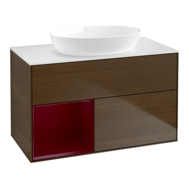 Villeroy & Boch V&B Meuble sous lavabo Finion 100, éclairage mural, blanc, avec tiroir, placage noyer veneer