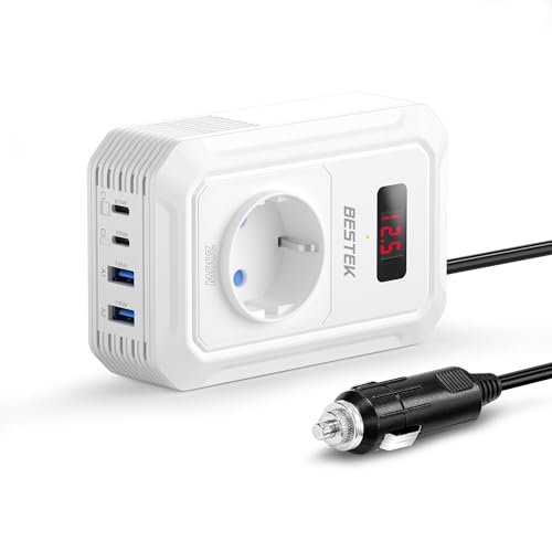 BESTEK Convertisseur 12v 220v 230v 240v 200W Prise Allume Cigare Transformateur de Tension,4 Ports USB et 1 Prises EU, Chargeur Voiture Camping Car avec Multi Protections (Blanc)