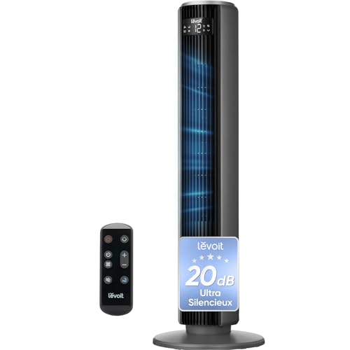 Levoit Ventilateur Colonne 20 dB Ultra Silencieux, Ventilateur de Table Moteur DC, Puissance jusqu'à 7 m/s, 4 Vitesses, Oscillation 90°, Minuterie 12H, Télécommande