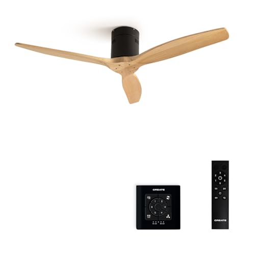 CREATE / WINDCALM M/Ventilateur de plafond ABS avec télécommande et contrôleur mural noir pales effet bois clair / 40W, Silencieux, Ø132 cm, 6 vitesses, minuterie, fonction été hiver