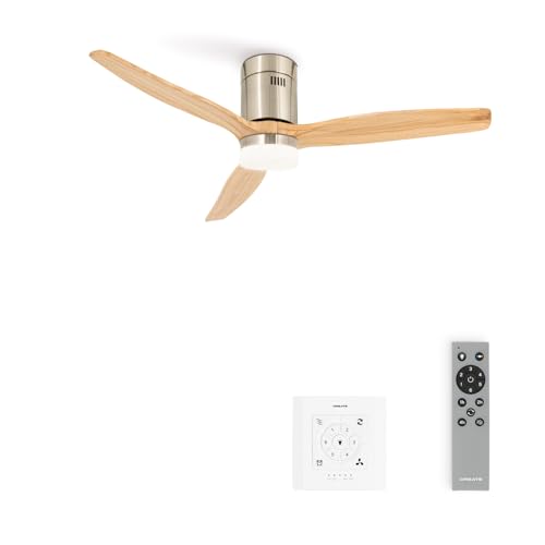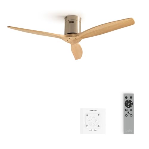 CREATE / WINDCALM M/Ventilateur de plafond ABS avec lumière et télécommande et contrôleur mural, niquel pales effet bois clair / 40W, Silencieux, Ø132 cm, 6 vitesses, minuterie, fonction été hiver