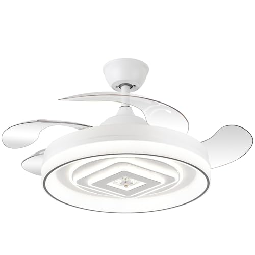 DRW Lampe Ventilateur de Plafond Blanc Design avec pales rétractables 3 Couleurs de lumières et télécommande Ø107 x 33-48 cm Lampe : ø50 cm