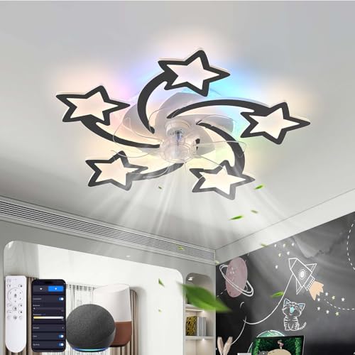 RGB Ventilateur Plafond Avec Lumiere Avec Télécommande APP, Enfant Alexa Lampe Ventilateur Plafond Réversible 6 Vitesses Dimmable Lustre Ventilateur Mémoire Silencieux Timing-Noir||Alexa