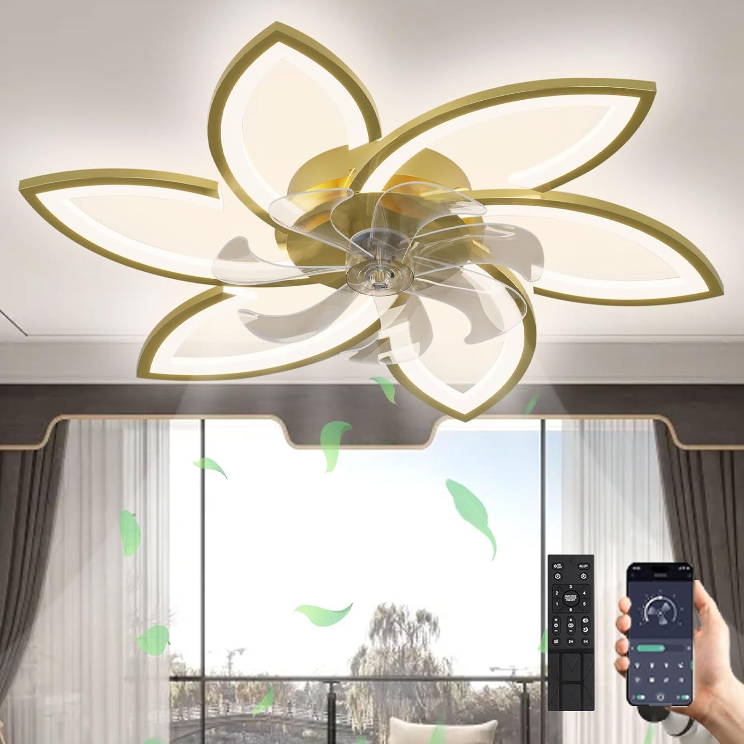 YUNZI 69cm Chromé Forme De Fleur Ventilateur De Plafond Avec Lumière Et Télécommande Ventilateur Silencieux Plafond Réversible Moteur DC 6 Vitesses Pour Chambre Salon Plafonnier Led-Gold
