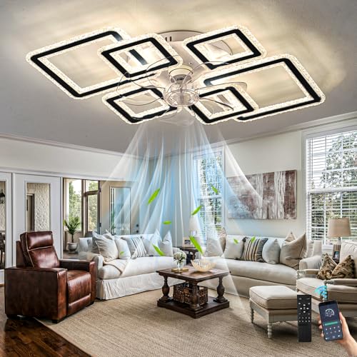 Cristal Lustre Ventilateur de Plafond avec Télécommande Silencieux Ventilateur Plafonnier Rétractable 6 Vitesses Réversible 3 Températures de Couleur Moderne Ventilo Plafond avec Lumière-Black||122CM