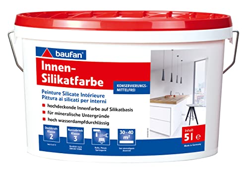 Baufan Peinture Silicate Intérieur 5L Blanc – Peinture Murale Haute Opacité pour Intérieur, Peinture Minérale Respirante pour Béton, Enduit et Maçonnerie, Finition Mate