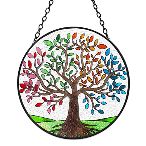 Tuitessine Arbre de vie en vitrail attrape-soleil sur le thème des quatre saisons - Feuilles colorées - Décoration murale à suspendre - Panneau de verre peint à la main - Cadeau pour femme - Cadeau de
