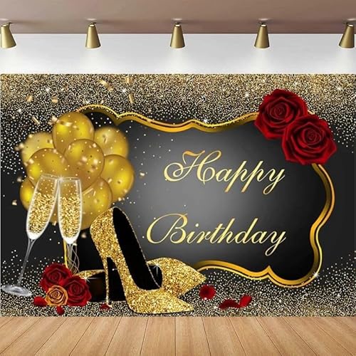 1.8x1.2m Toile de Fond Anniversaire Paillettes Or Rose Joyeux Anniversaire Talons Hauts Verre de Champagne Fond Photographique Femmes décorations fête d'anniversaire bannière Accessoires photomaton