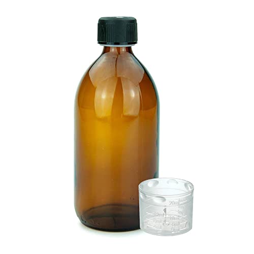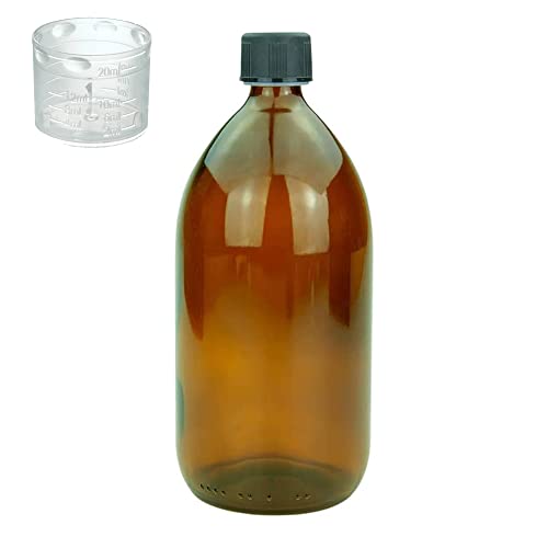 Devitre Bouteille en verre marron de 500 ml avec couvercle, verre doseur et étiquette d'inscription