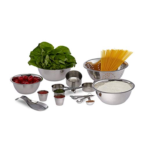 Relaxdays Set cuisine Bol mélangeur passoire pot verre doseur cuillère dosage mesure 15 pièces inox empilable, argenté