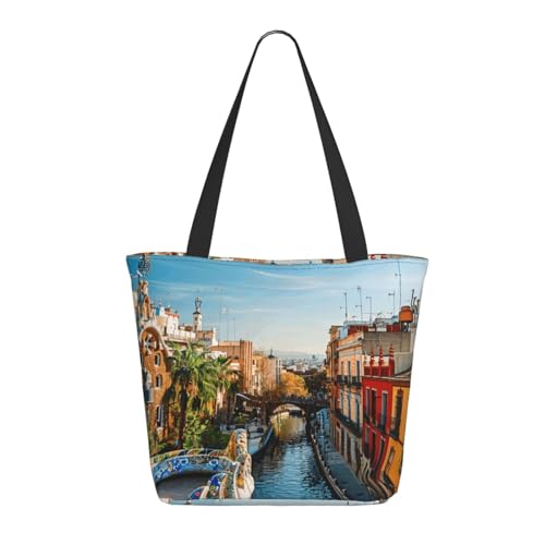 LRHCNZDCP Grand sac fourre-tout avec imprimé verre à vin et coucher de soleil - Sac à main léger pour femme - Pour le travail, les voyages, le shopping, Ville aquatique Espagne, Taille unique