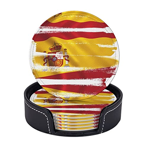 Lot de 6 dessous de verre ronds en cuir avec drapeau de l'Espagne pour boissons Cadeau de pendaison de crémaillère Tapis de tasse rond pour la maison et la cuisine