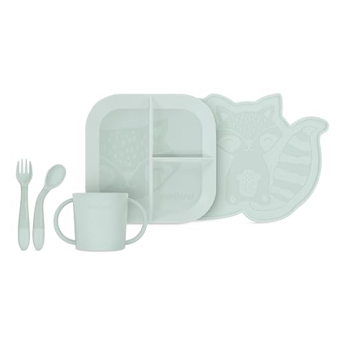 Miniland Meal Set BLW Mint. Vaisselle complète pour BLW comprenant une assiette, un bol, un verre, des couverts flexibles et une nappe, fabriquée en Espagne avec des matériaux de haute qualité