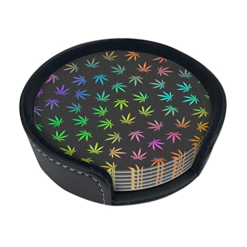 Rainbow Weed PotLeaf Dessous de Verre en Cuir néon pour Boissons Lot de 6 avec Support de Protection Dessous de Verre pour Tasse à café pour Cadeau de Pendaison de crémaillère Décoration d'intérieur