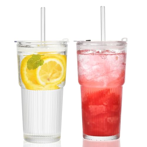 TOPPERFUN Verre à Boire Rayé Vertical Avec Couvercle Et Paille Tasse Verre Transparente Multifonction Pour Café Thé Lait Jus Réutilisable