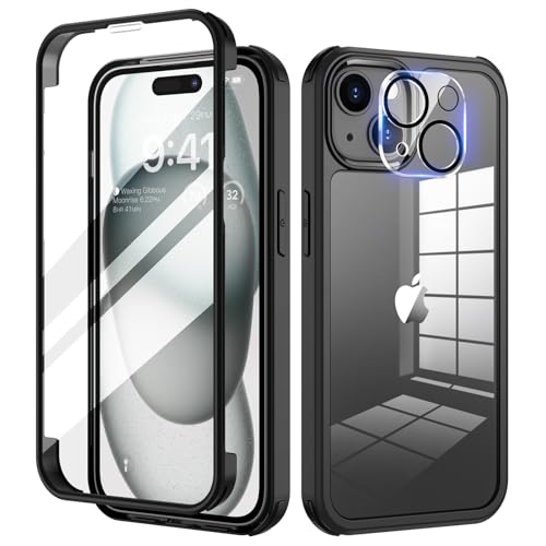 seacosmo Coque pour iPhone 15 6,1 Pouces, Antichoc Housse avec Verre Trempé Protection écran +[9H Dureté Caméra Arrière Protecteur] Intégrale Mince 360°Protection Bumper Robuste Transparente - Noir