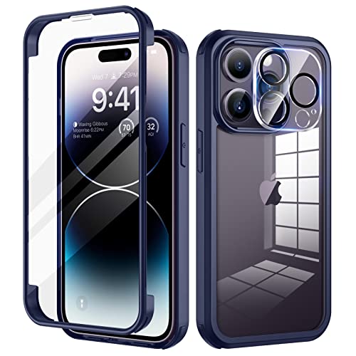 seacosmo Coque pour iPhone 14 Pro 6,1 Pouces, Antichoc Housse avec Verre Trempé Protection écran +[9H Dureté Caméra Arrière Protecteur] Full Body Protection Integrale Bumper Rubuste Etui - Bleu