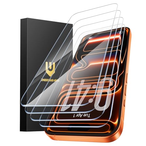 UNBREAKcable Lot de 4 protections d'écran pour iPhone 17, double verre trempé incassable [cadre d'installation facile] [dureté 9H] [99,99% HD transparent] [compatible avec les coques] pour iPhone 6,3