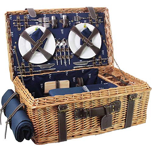 Les Jardins de la Comtesse - Panier Pique-Nique Marine - Complet pour 4 Personnes - Compartiment Glacière Isotherme/Nappe Imperméable - Assiettes en Céramique/Verres à Vin en Verre - 45 x 31 x 24 cm
