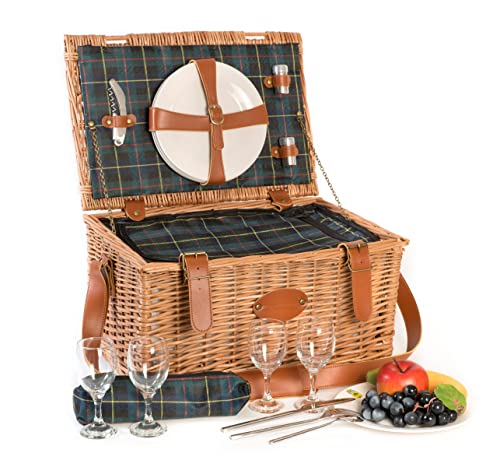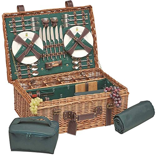 Les Jardins de la Comtesse - Panier Picnic Champs Elysées Vert en Osier - Sangles en Cuir - Complet 4 Personnes - Glacière/Nappe - Assiettes en Porcelaine et Verres à Vin en Verre - 57 x 37 x 23 cm