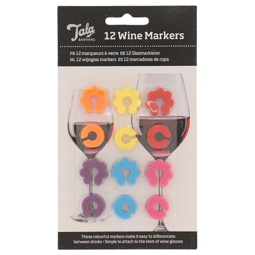 Tala Marqueurs pour Verres à Vin Barware, Ensemble de 12 Charmes en Silicone pour Identifier les Verres, Idéal pour les Fêtes, Couleurs et Formes Assorties