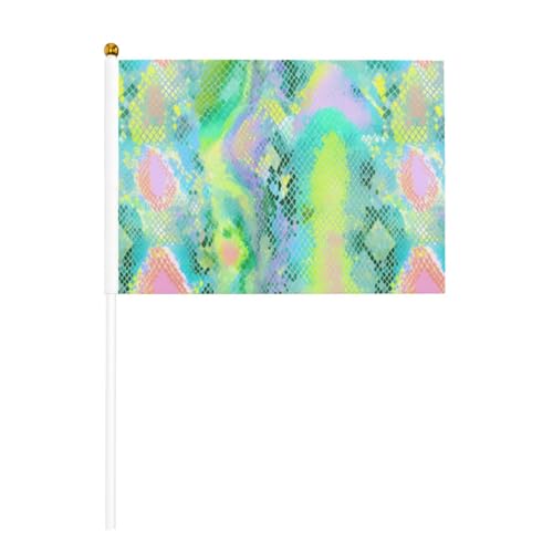 Lot de 10 petits drapeaux à main à motif peau de serpent vert menthe fluo sur bâton pour fête, activités d'équipe, défilés, décoration de vacances