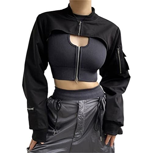 ORANDESIGNE Veste Cargo Femme Coupe-Vent Ample à Manches Longues Fermeture éclair Manteaux Légers Veste de Bombardier Rétro Y2k Veste de Sport de Baseball Vintage Streetwear J Noir XS
