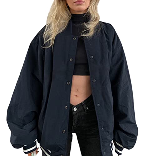 ORANDESIGNE Veste Cargo Femme Coupe-Vent Ample à Manches Longues Fermeture éclair Manteaux Légers Veste de Bombardier Rétro Y2k Veste de Sport de Baseball Vintage Streetwear K Bleu Foncé L