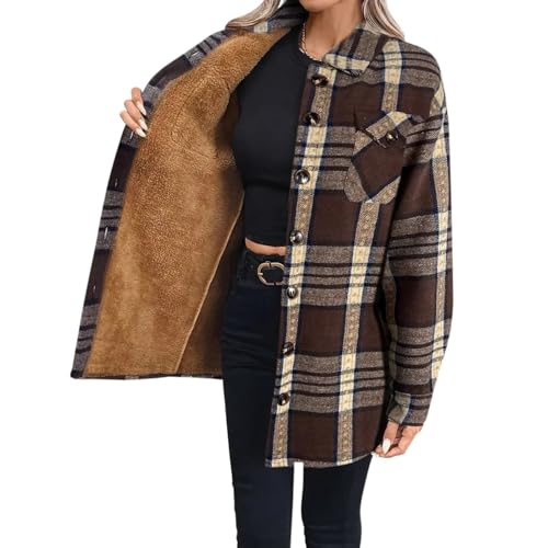Generisch Veste d'hiver pour femme - Manteau d'hiver long élégant cintré - Manteau d'hiver décontracté et confortable en laine chaude - Veste d'hiver à revers - Veste chemise à carreaux - Veste de