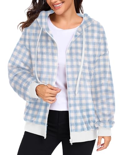 PrinStory Sweat à capuche zippé en polaire pour femme - Avec fermeture éclair - Manches longues - Veste à capuche d'hiver, Motif à carreaux bleus et blancs, L