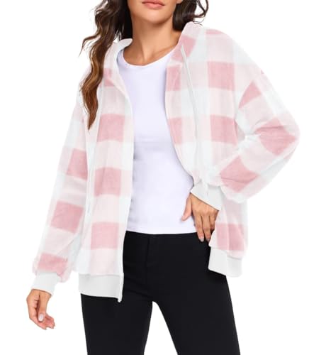 PrinStory Sweat à capuche zippé en polaire pour femme - Avec fermeture éclair - Manches longues - Veste à capuche d'hiver, Grand motif à carreaux rose, S